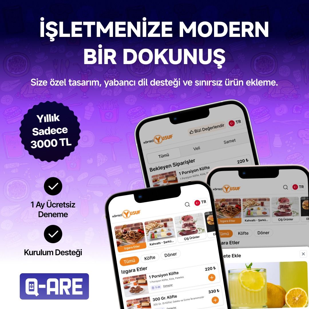 Q-Are Menü, restoran ve kafeler için QR tabanlı dijital menü, sipariş takibi, çoklu dil desteği ve kolay yönetim sunan akıllı bir menü çözümüdür.